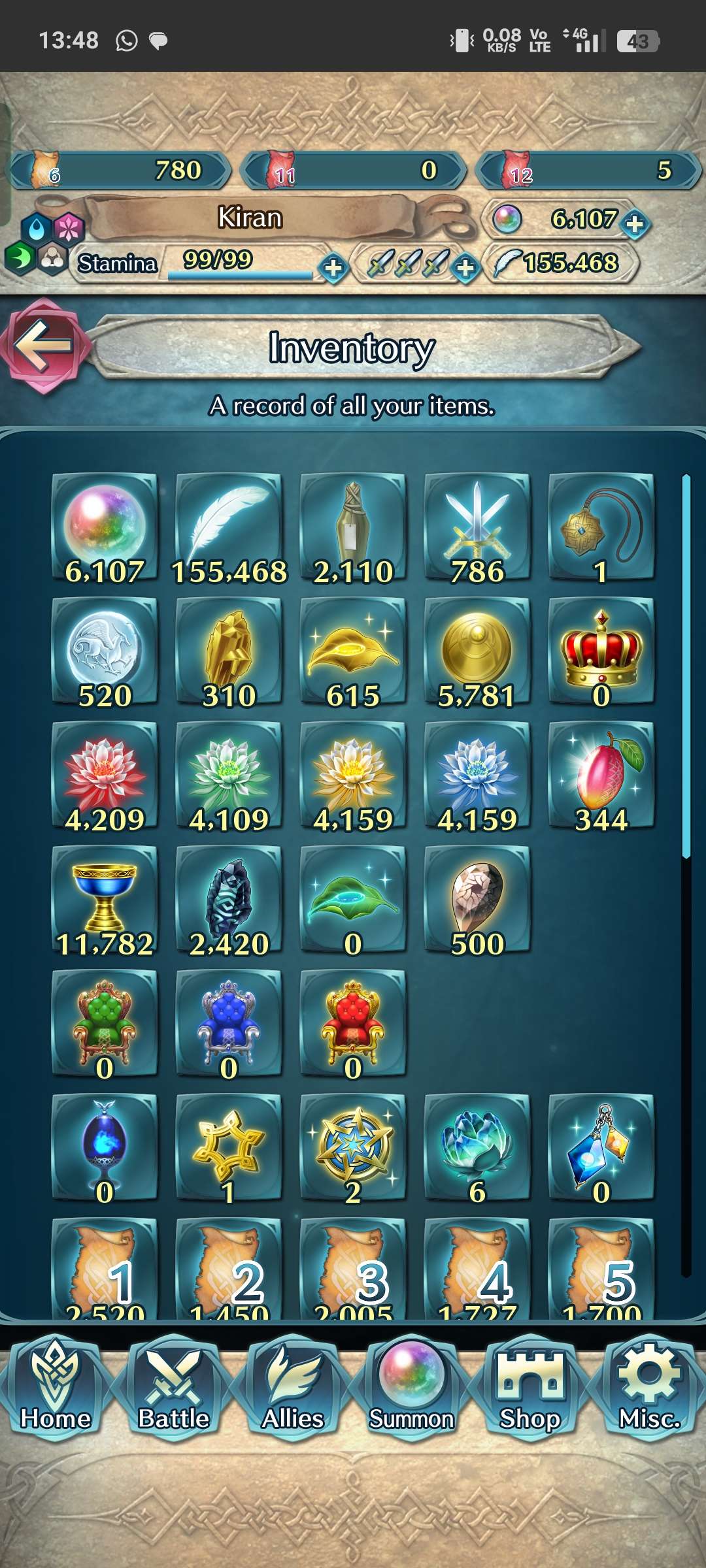 About 6,100 Orbs (unclaimed in the mailbox). See Sample Picture for Resources (Similar). 210+ 5-Star Heroes (Guarantee Units shown in the picture, others are Random)